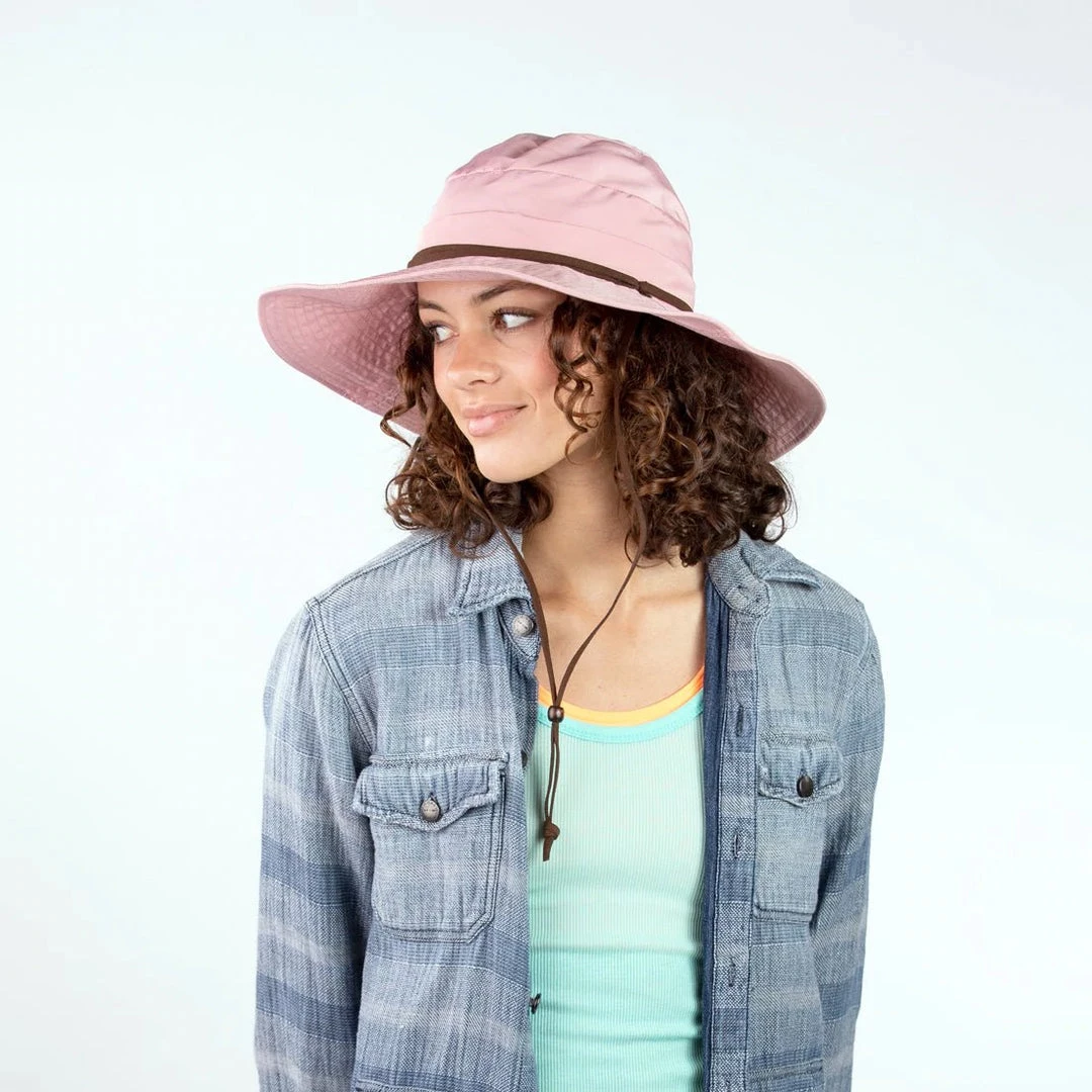 Perfect packability and extra coverage make the Mina a great travel companion. The wide brim puts your neck and face in the shade, while a mesh-lined crown keeps air flowing. The faux suede band and chin strap and wood-bead slider on this women’s hat add Pistil’s signature.
