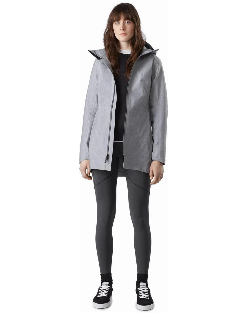 With an intentional design featuring a clean aesthetic and conscious material choices, our heathered Codetta is created for the city and the planet. Its waterproof, windproof, breathable GORE-TEX fabric is made with recycled yarns and a less resource-intensive dye process. Thigh length, it has a cinched back with trench-style for a clean, classic look and fit. The adjustable hood’s brim extends protection, and the front zipper’s two-way slider lets you unzip the bottom to free your stride.