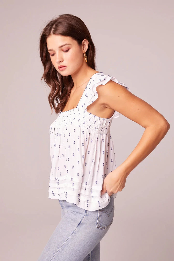 With a delicate woven dot pattern, our feminine Echo top has softly ruffled straps and a square smocked neckline.