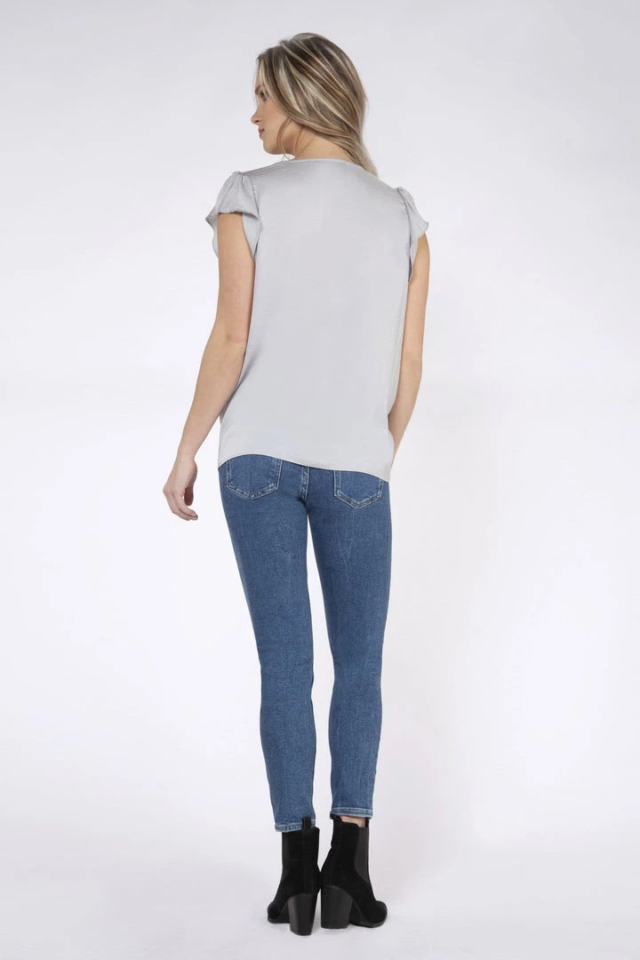 V-neck flutter sleeve blouse in a pretty silver perfect for the upcoming holidays.Â