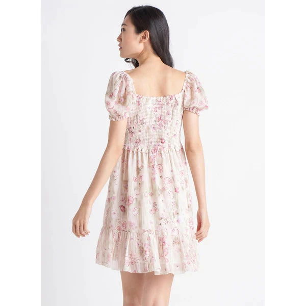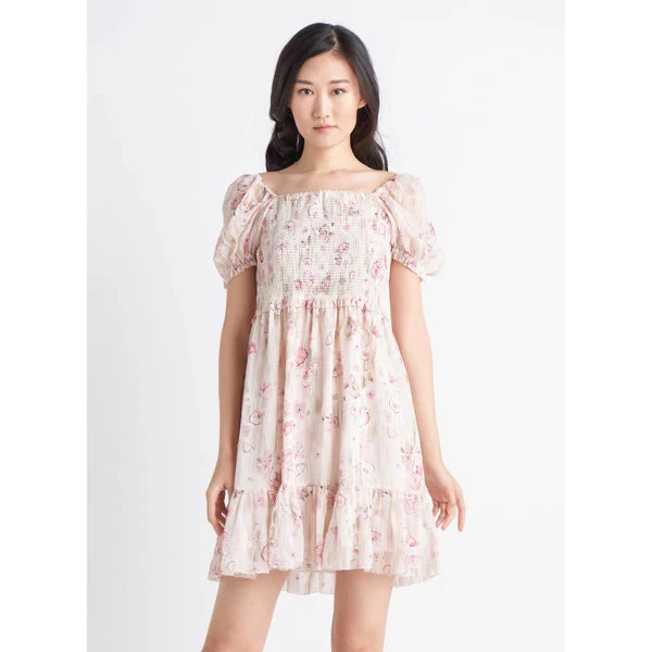 Black Tape smocked tiered mini dress with a floral print.