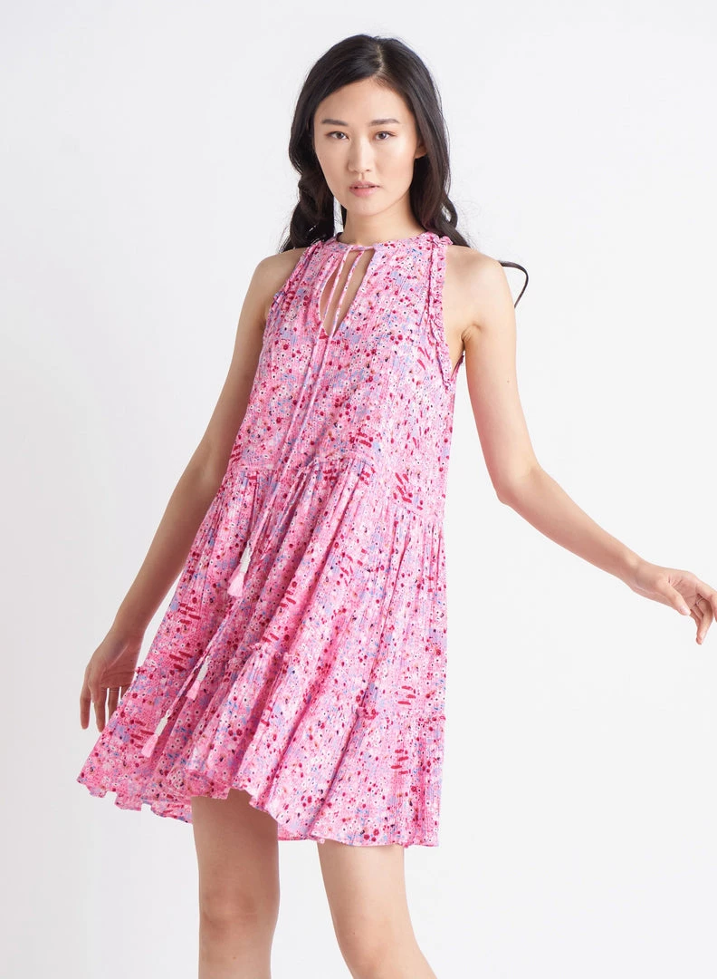 Playful and jaunty, this printed tiered mini dress is elevated by its cutout neckline with tassel tie-ups.
