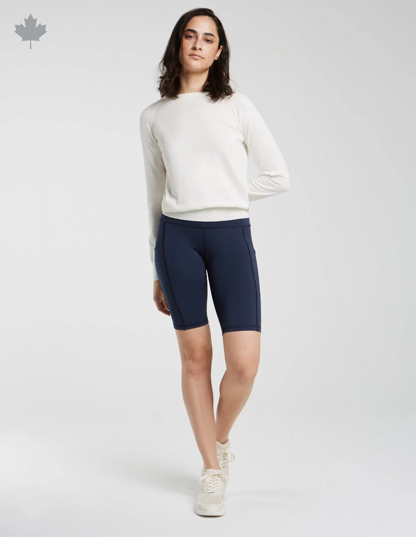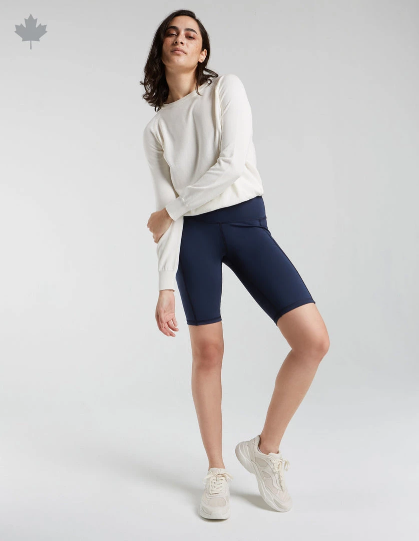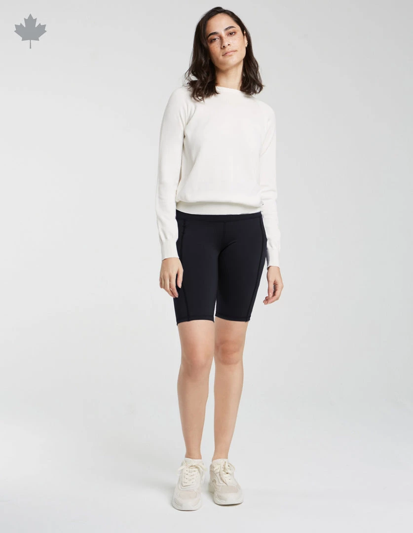 Stretch bike short made with Möbius Flex™, which is made with recycled polyester, created by using post-consumer plastic bottles. High-rise ultra opaque bike shorts with built-in gusset, two side pockets, and comfortable and compressive waistband.