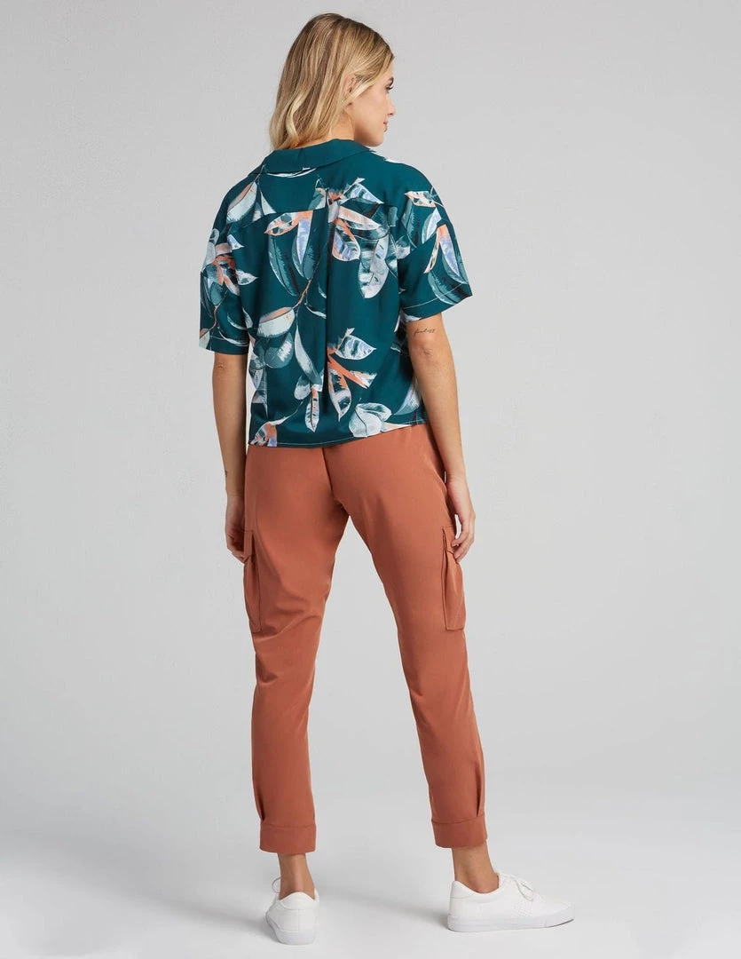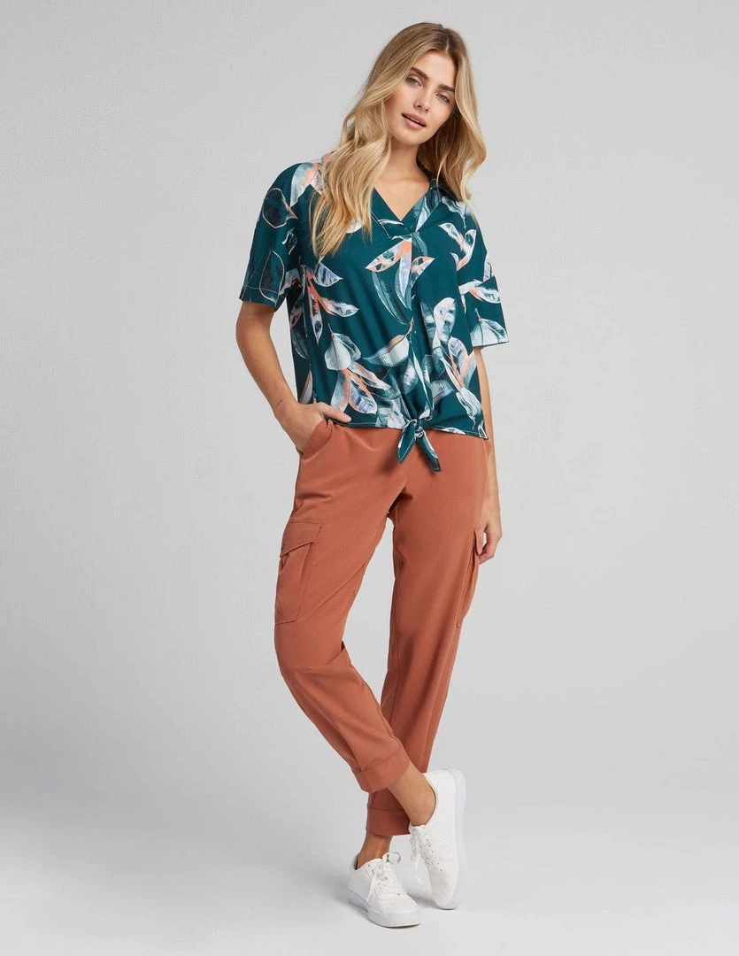 Lightweight boxy collared V-neck top with short sleeves made with Möbius LT, which is made with recycled polyester, created by using post-consumer plastic bottles. Top knotted at the front with ease pleat at back yoke. Lightweight, stretchy, easy care and quick-drying fabric that’s wrinkle resistant and that offers a UPF 25 solar protection.