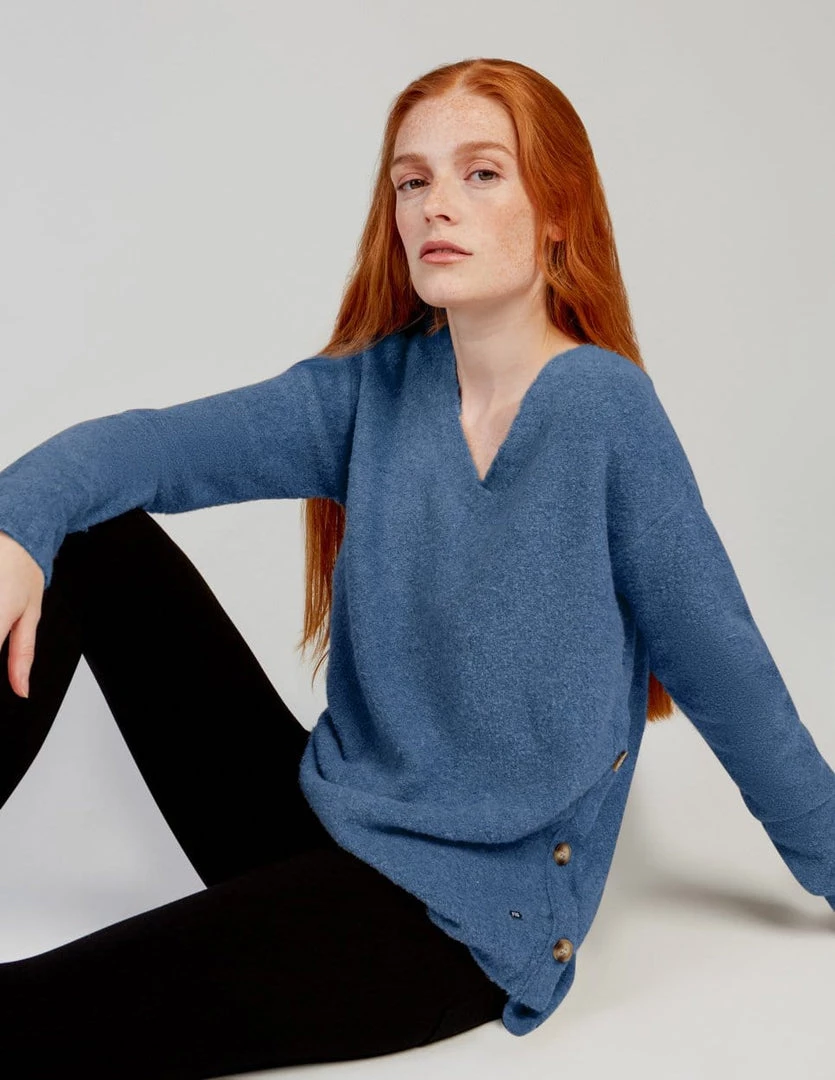 Supple and soft V-neck sweater made with TENCEL™ Modal, sourced from sustainable beech wood and produced in an environmentally responsible pulp to fiber process. Top with drop shoulders and side decorative tortoise buttons.