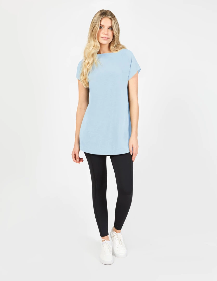 The Harrow Tunic Dress. Boat neck collar tunic made with TENCEL™ Modal, sourced from sustainable beech wood and produced in an environmentally responsible pulp to fiber process, and with Möbius LT, made with recycled polyester, created by using post-consumer plastic bottles. Boxy fit tunic with short sleeves, side-seam pockets, curved hems, and Möbius LT fabric at back panel.