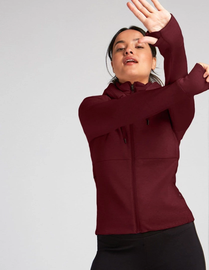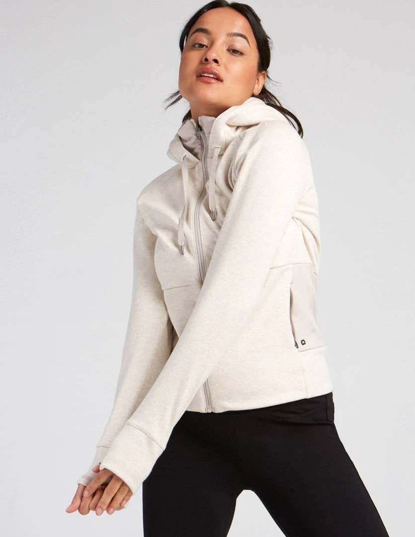 Soft hoodie with YKK® zipper at center front made with Flex fleece, which is made with recycled polyester, created by using post-consumer plastic bottles. Top with two side pockets with YKK® invisible zippers, drawcords at hood, collar filled with Ecotherm 40g insulation, thumbhole at cuff, and back yoke cut.