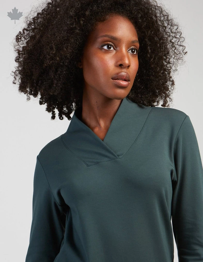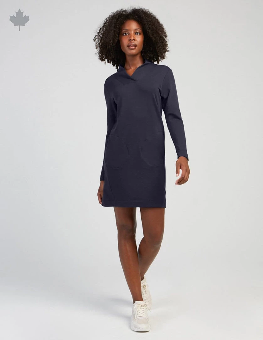 Soft and warm dress with crossed stand-up collar made with TENCEL™ Modal, sourced from sustainable beech wood and produced in an environmentally responsible pulp to fiber process. Dress with two side pockets.