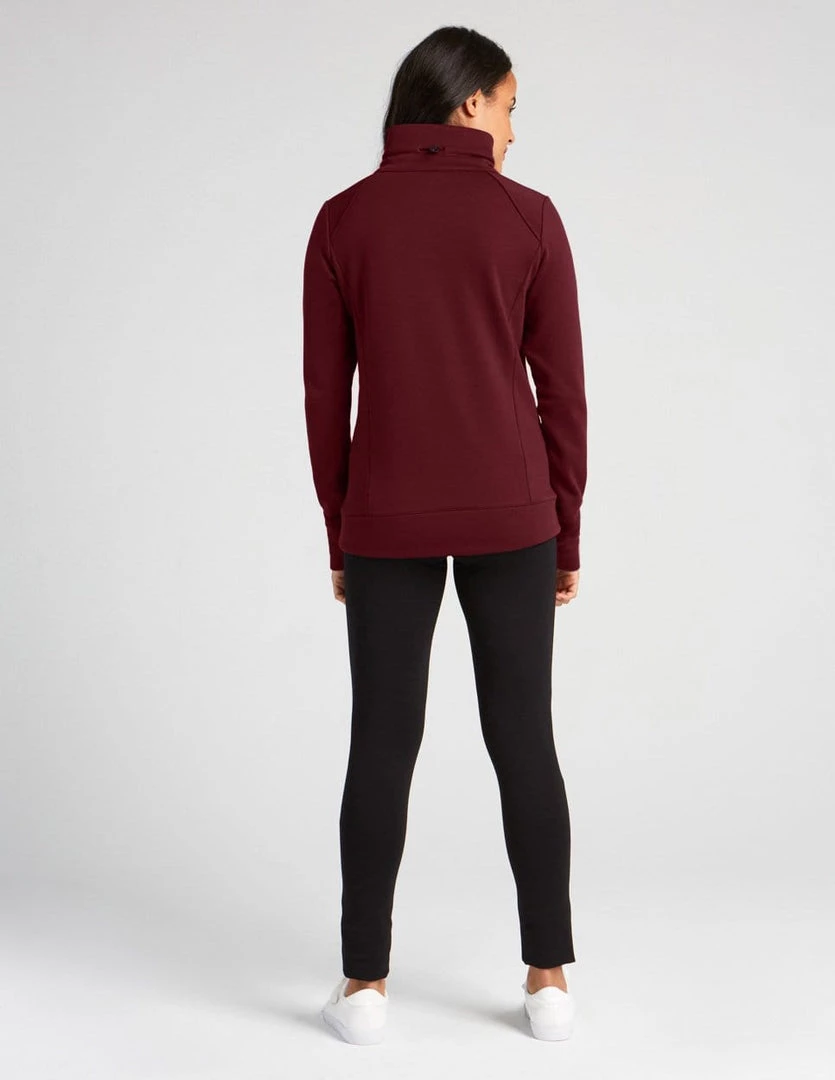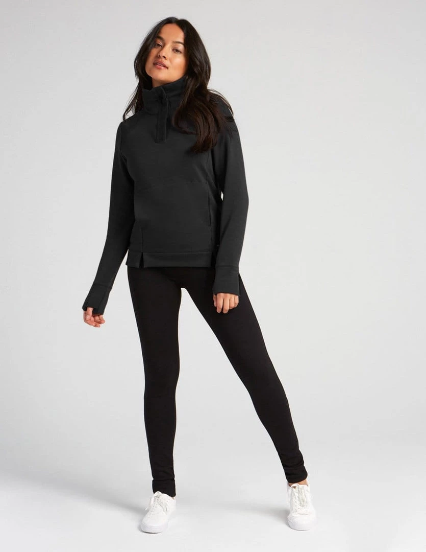 Soft stand-up collar sweater made with Flex fleece, which is made with recycled polyester, created by using post-consumer plastic bottles. Top with front placket with snap buttons, slits at front, back collar adjustment, thumbhole at cuff, shoulder cuts, and hi-low hemline.