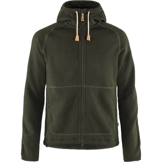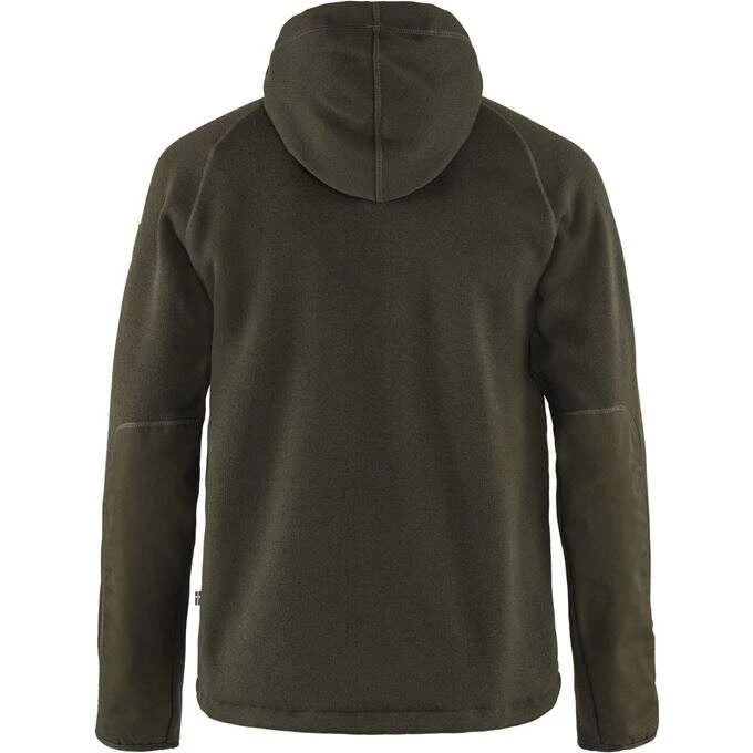Warm and cosy fleece jacket with a knitted exterior and a soft brushed inside. Perfect as an insulating mid layer under a shell jacket on autumn or winter adventures, and just as comfortable for long afternoons with a good book in front of the fire. It has a fixed hood with a drawcord adjustment and the zipper at the front has a protective flap in G-1000 original that protects the chin. The elbows, hem, pockets and inside of the edge of the hood also have G-1000 for extra durability. Two spacious pockets with zippers. Elastic binding at the sleeve cuffs and drawcord adjustment at the hem. The fleece and mesh lining in the pockets are made from recycled polyester and produced using an environmentally friendly process that both spins and dyes the fibres at the same time. This leads to much lower levels of water and energy consumption compared to traditional dyeing techniques.