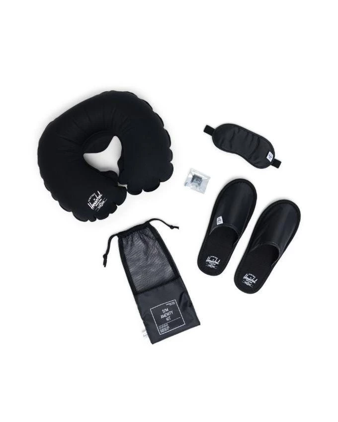 Accompanied by a convenient storage pouch, the Standard Issue Amenity Kit includes ear plugs, a sleeping mask, slippers and an inflatable neck pillow for maximum in-flight comfort.