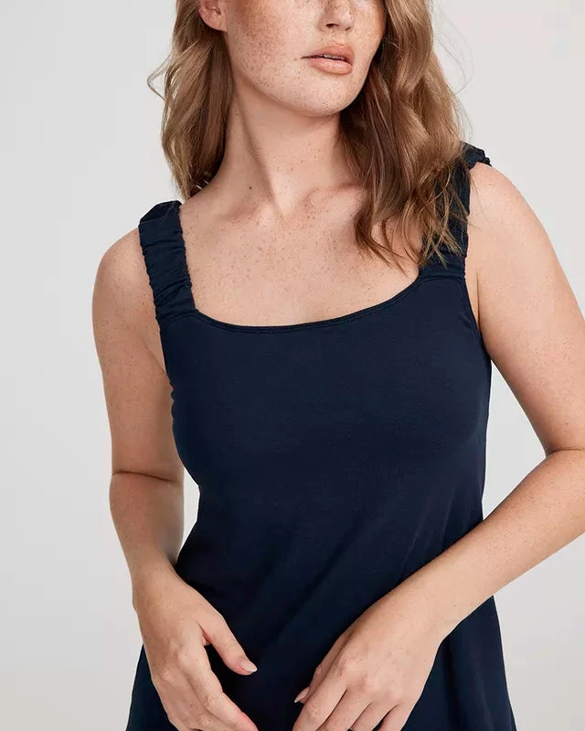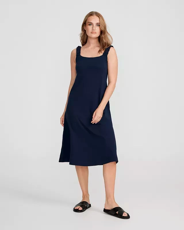 Sleeveless dress made of soft cotton/elastane blend. Regular fit and wider shoulder straps with gathered fabric.Â