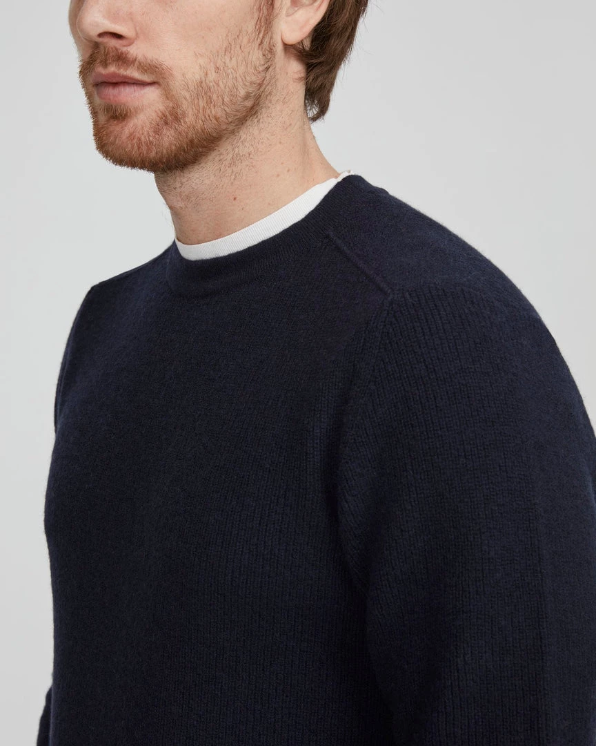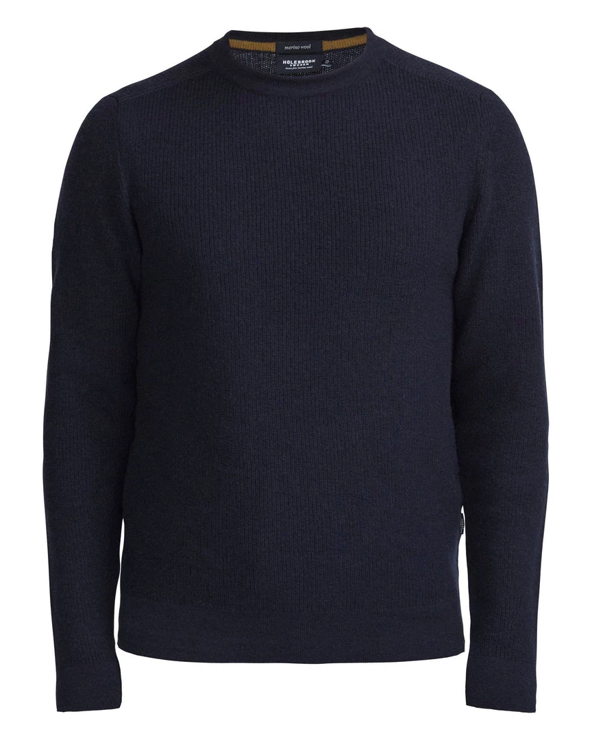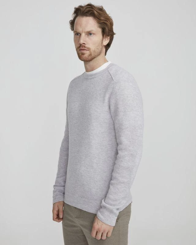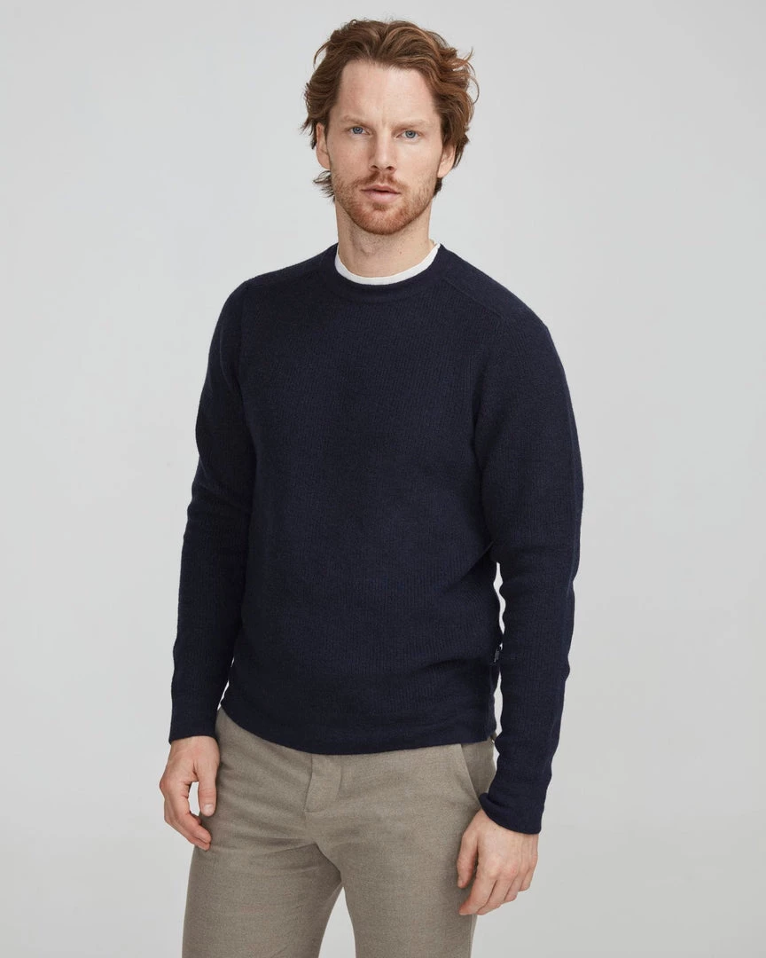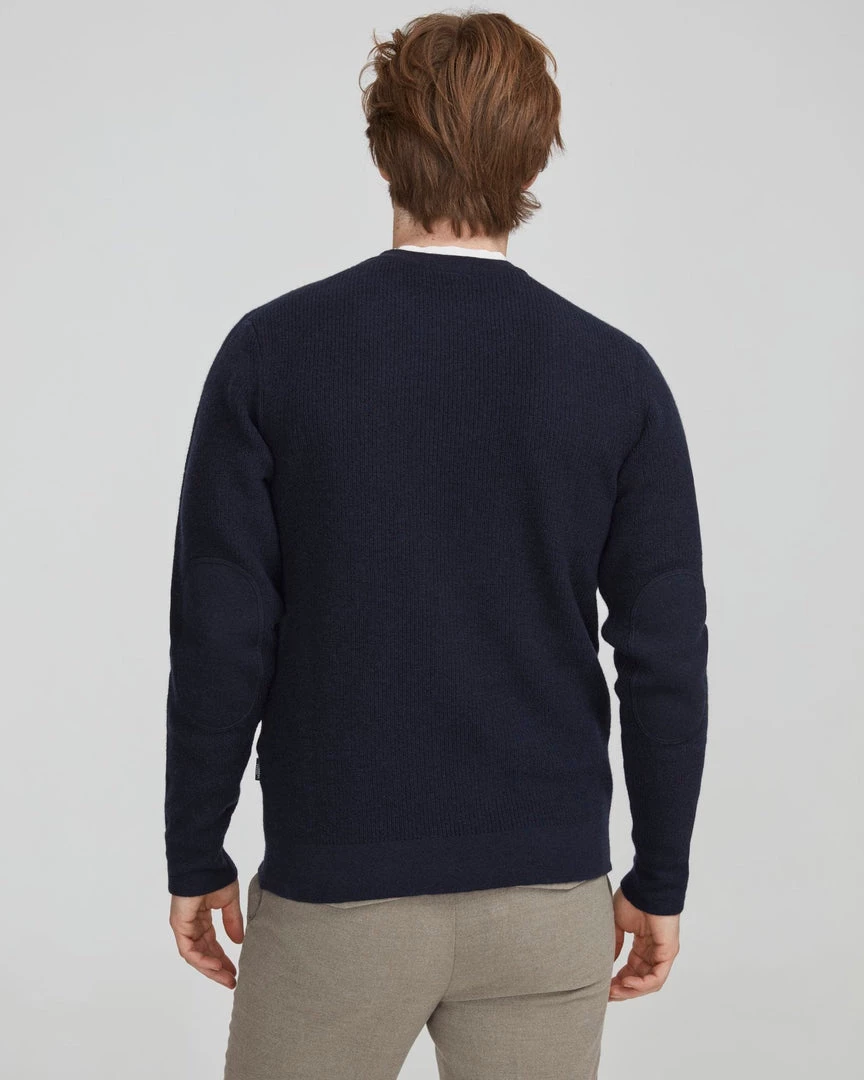 Knitted sweater in 100% soft merino wool. Structure knit with flat knitted patches at the elbows. Contrast knitted shoulders. Ribbed cuffs and hemline.Â