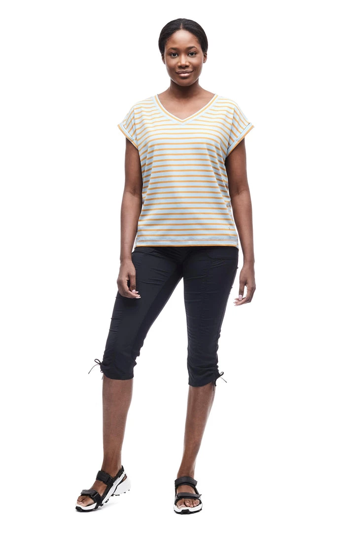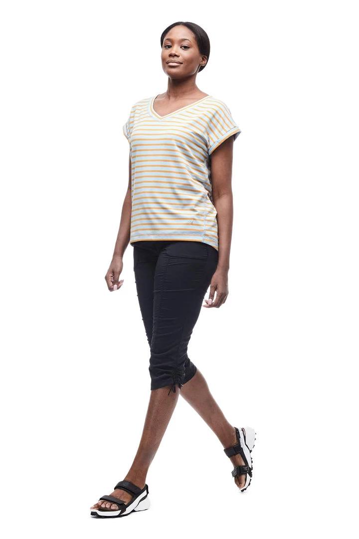 The SOFI top is made from fabric containing Lyocell, a fibre made of wood cellulosic obtained from sustainable forests. Partially eco-friendly, drirelease® Lyocell ensures long-term fabric performance and maintains its softness after wash. It has moisture-wicking and fast drying properties, which minimizes odours and maximizes comfort and has a UPF rating 30+. These features make this top versatile, great for travel and various outdoor activities.