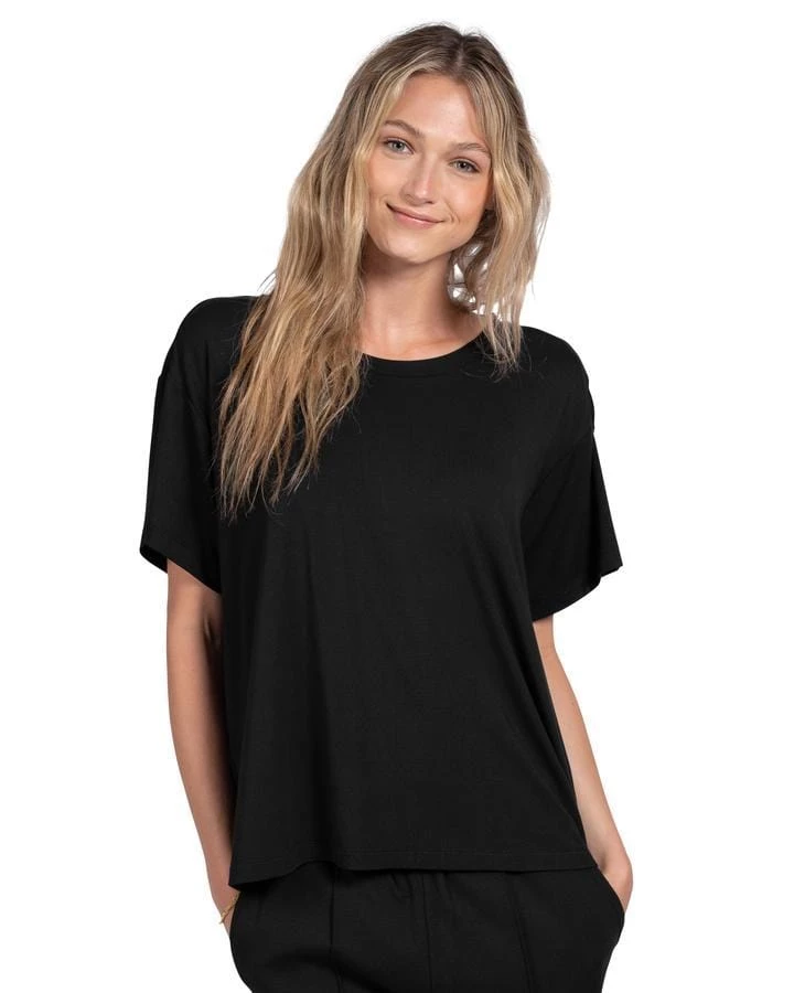 Our wear-with-everything short sleeve crew neck t-shirt is in a relaxed and oversized silhouette. This core piece is made in our super silky and soft draping rayond spandex fabric.