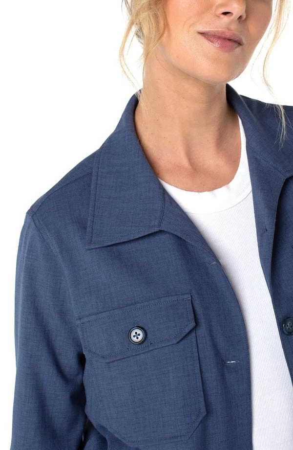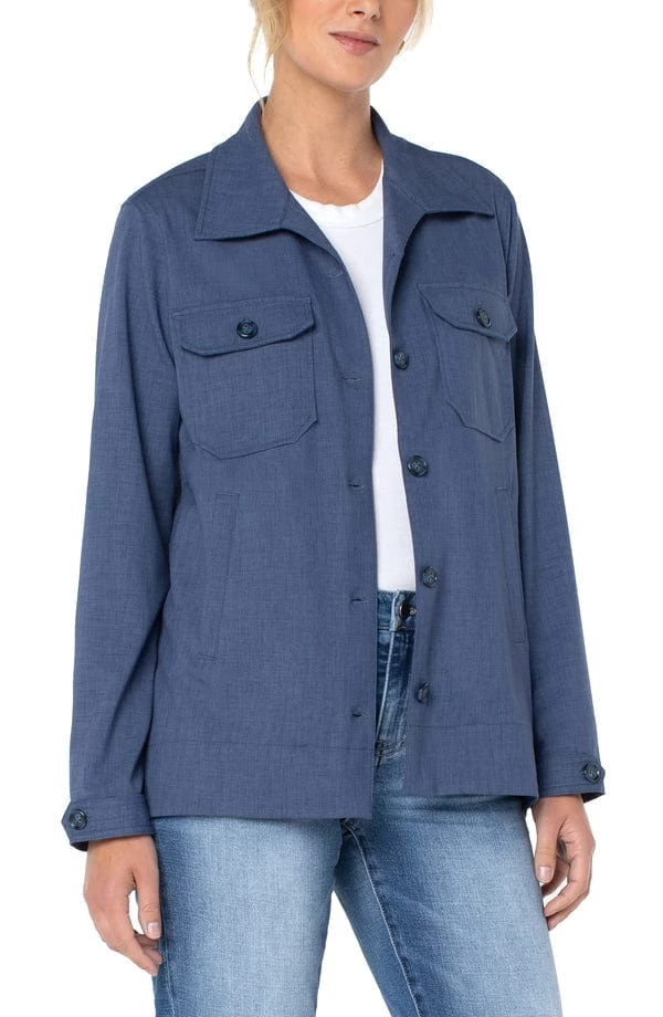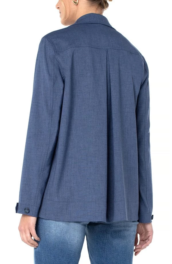 The shirt jacket gets an upgrade! Featuring a back placket to create a billowing effect, this fabulous stretch woven shirt is fantastic from season to season.Â