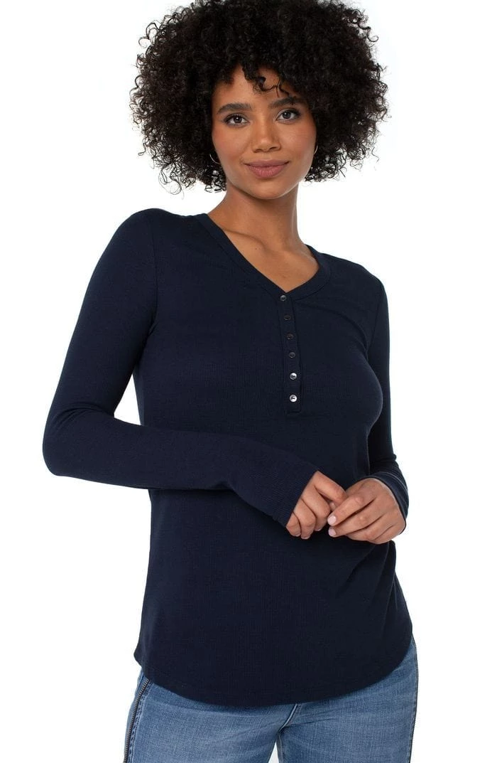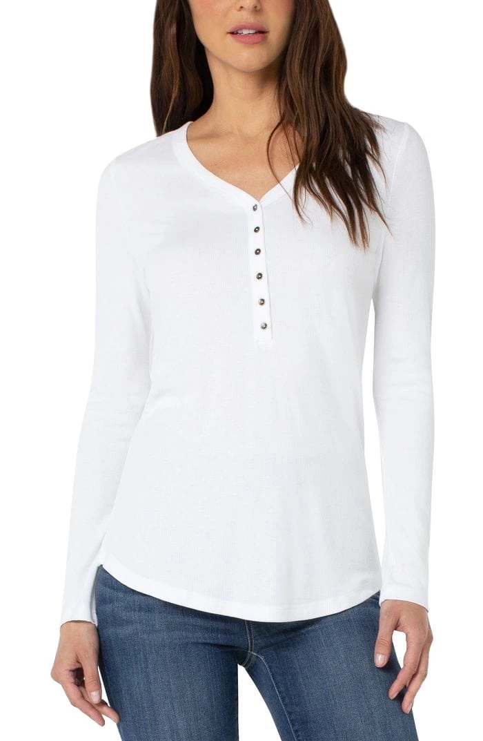 The perfect long sleeve henley in our 2×2 mini rib knit. Super comfortable and easy to layer. The rounded hem finish gives you the option to front tuck or let the hem out. Available in multiple colors. Â
