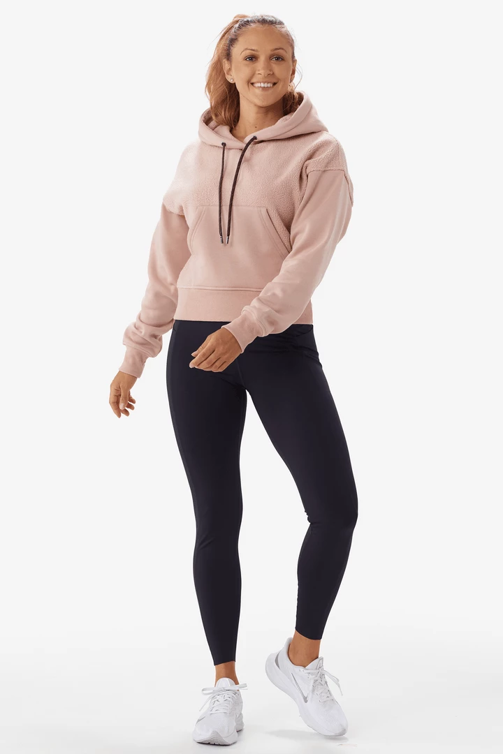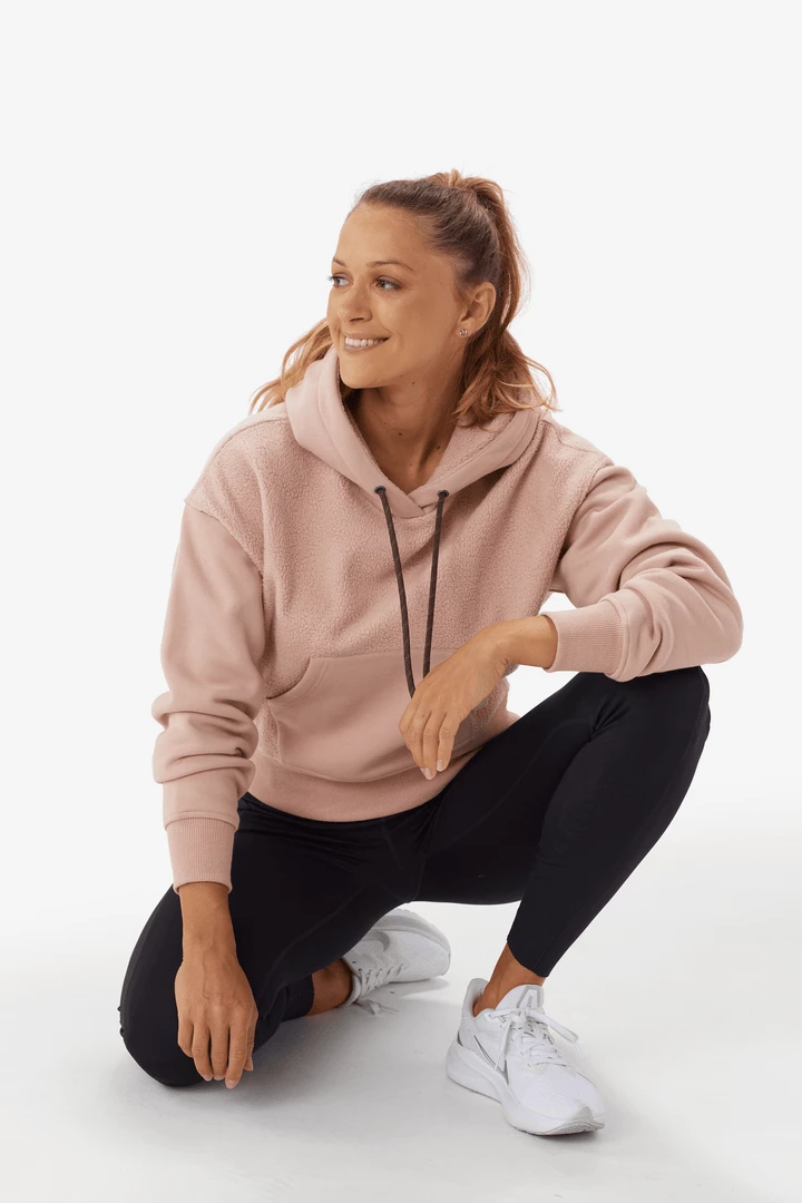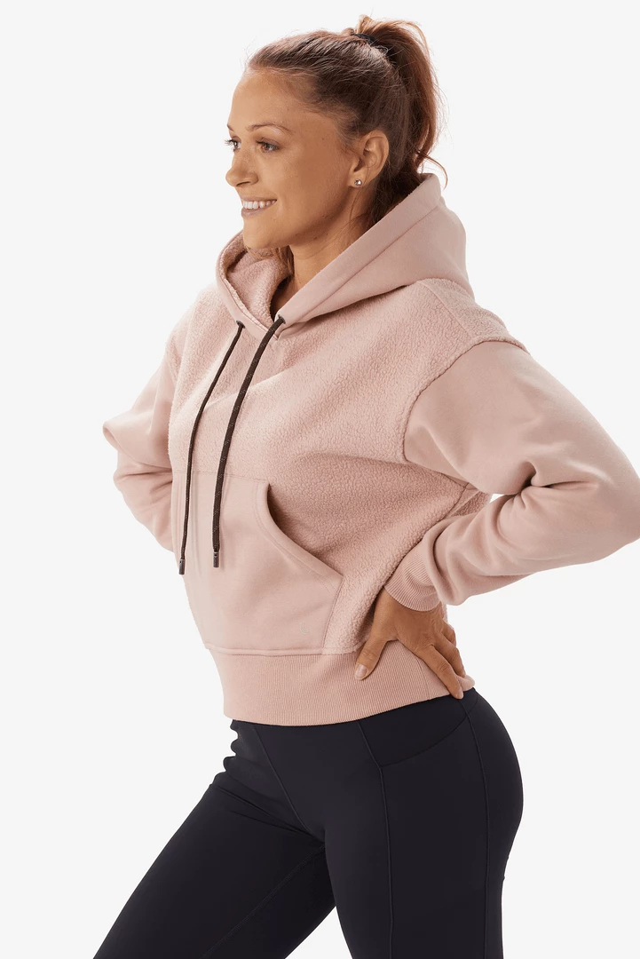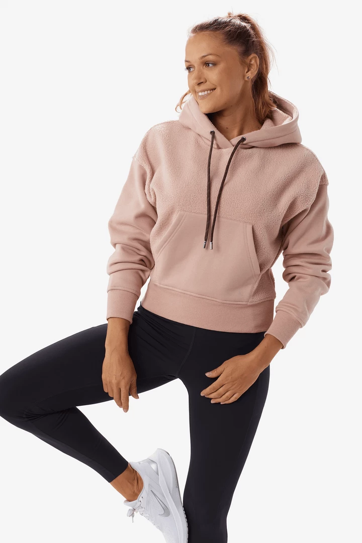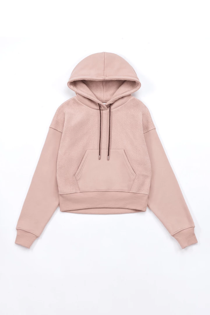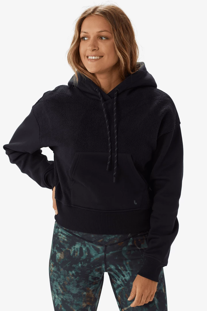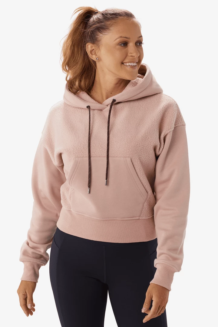 This relaxed fit pullover made of our Comfy Double Knit plays with fabric, with contrasting sherpa and cotton. The structured hood with a drawstring provides cozy coverage and protection from the cool breeze, with kangaroo pockets complete with a small, inner mesh pocket to keep your belongings safe.