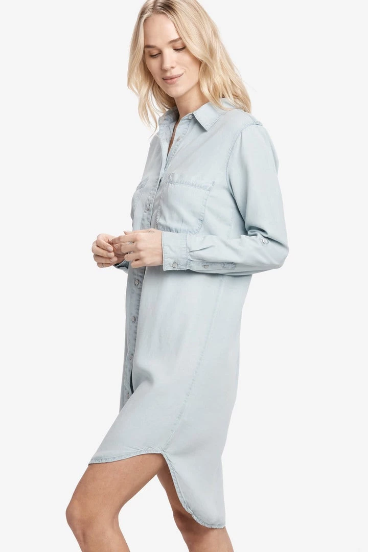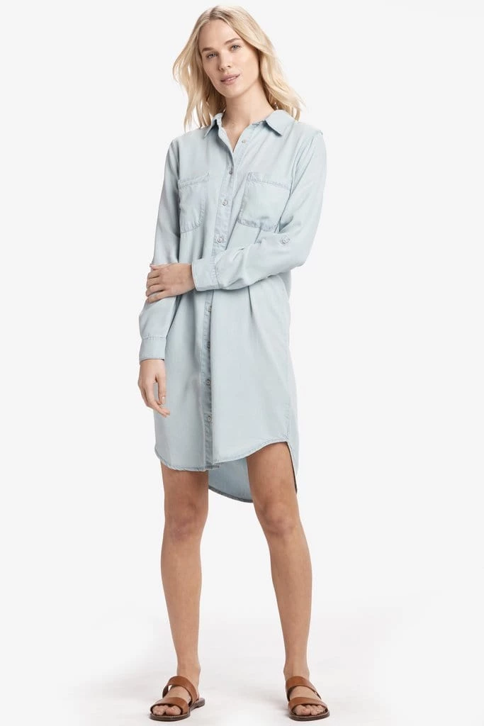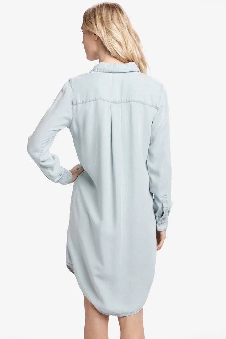 This shirt dress has a longer hem at the back, fold-up sleeves and a casual cut.