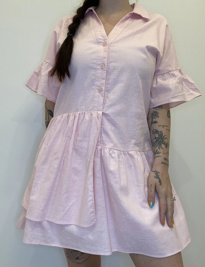 Pink mini dress, V neckline with collar detail, button-up closure on center front, short sleeve, wide frill on sleeve, and asymmetric frill feature on the waistline