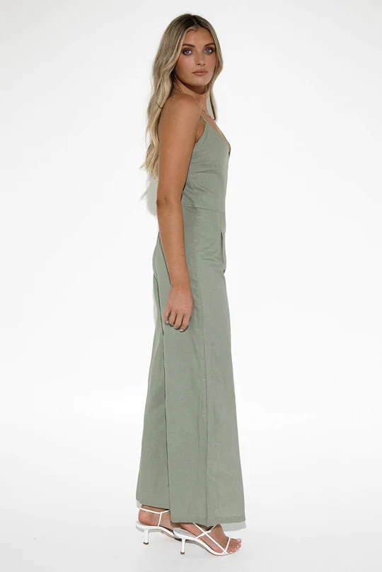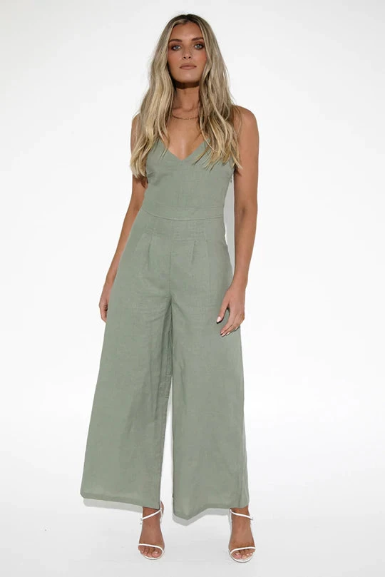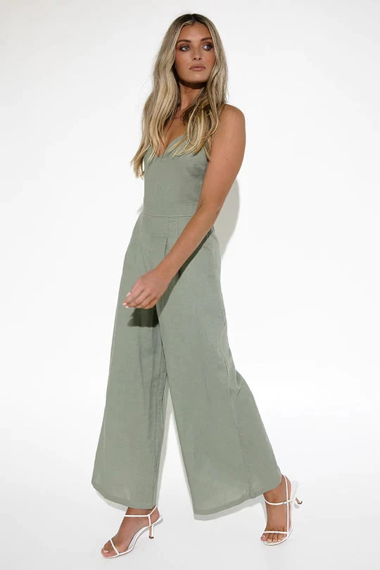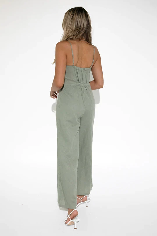 Khaki green wide-leg jumpsuit, V neckline, thin shoulder straps, fitted waistline, pleated detail on front and a structured fit.