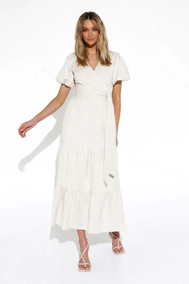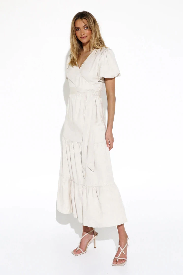 Light stone beige short sleeve maxi dress with puff sleeves.Â