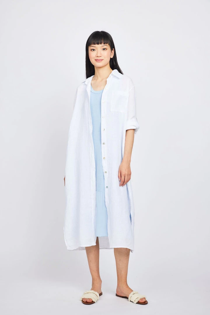 The Maxi Linen Blouse Dress is a long, flowing, and light dress. It features a button-up blouse with a high neckline. The dress is perfect for work or for any event.