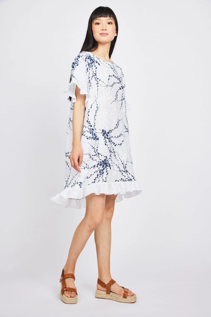 This feminine white linen dress is styled with a ruffle hem, deep v-neckline, and soft pleats. It’s perfect for any occasion but looks especially lovely with a pair of white strappy sandals.