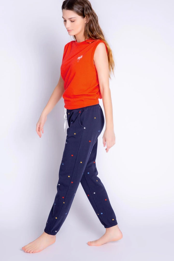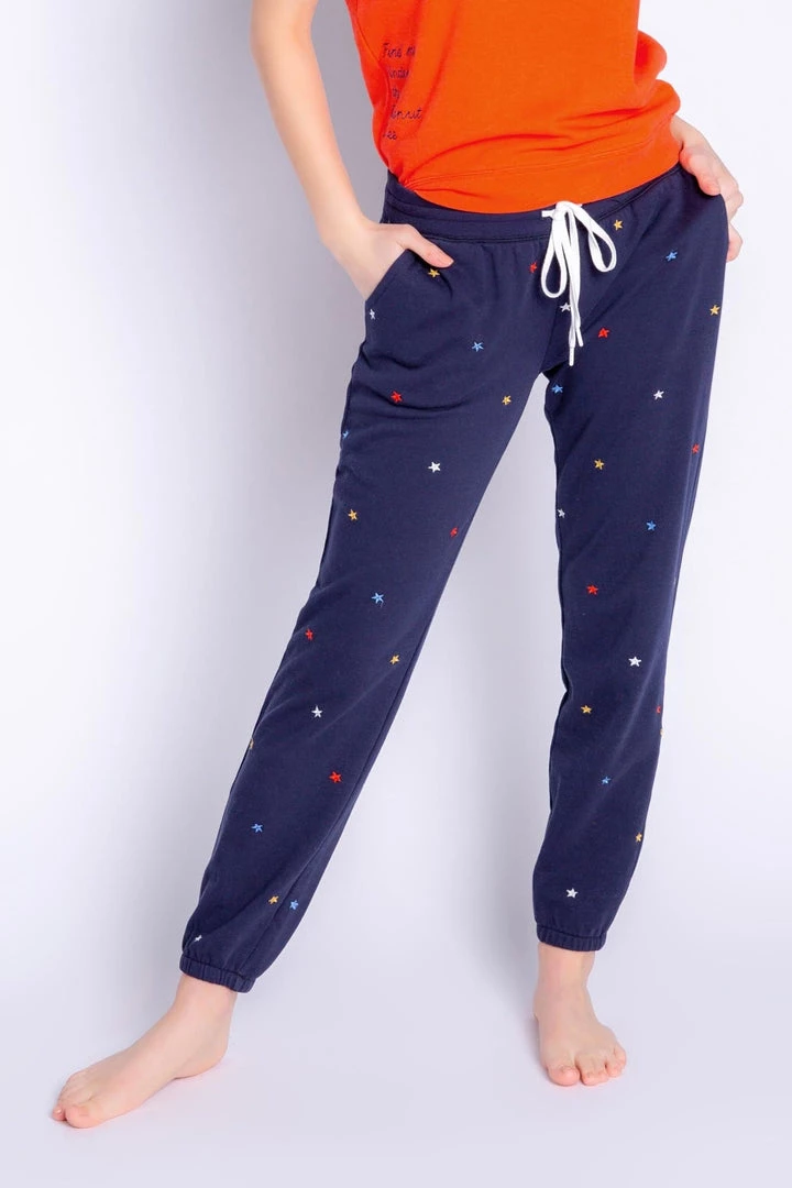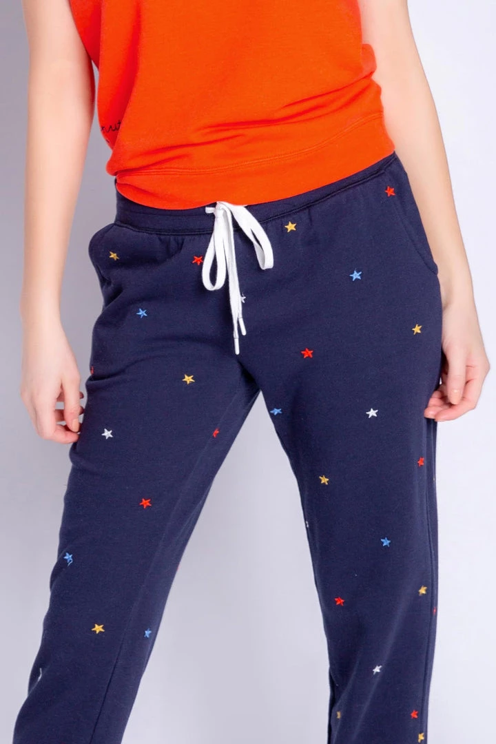 Your new everyday jogger in versatile navy cotton-blend terry knit. A go-anywhere banded pant with pockets and tri-color embroidered mini stars.