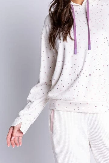 DESCRIPTION:Â The perfect hoody for those chilly days. Her fleece was white as snow – in our dot-print fleece hoody. Perfect to grab a coffee with your besties. Care tip: Wash inside out in cool water, don’t mix with towels to minimize piling.