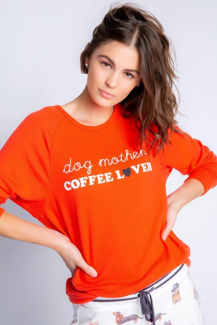 Tell us about yourself? Say it with a bright red embroidered & printed top that reads “Dog Mother, Coffee Lover”. Super soft, NEW Peachy jersey blend.
