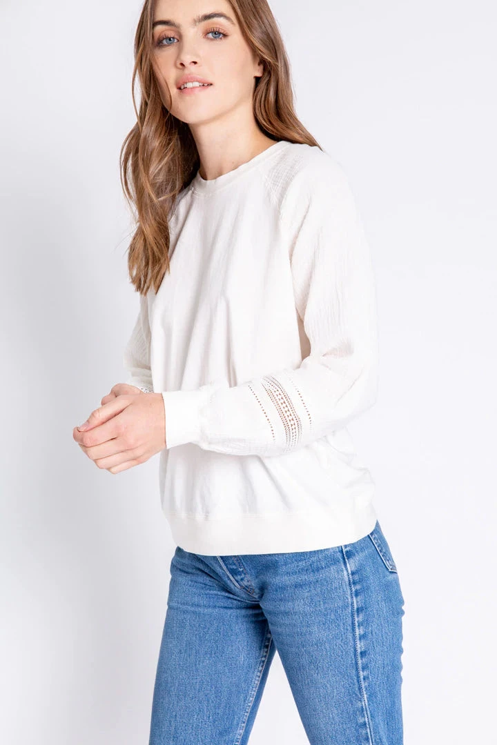An effortless statement top that styles like a gauzy cotton blouse, and wears like a cotton pullover. A relaxed fit top with delicate sleeve details. Designed in 100% cotton gauze.