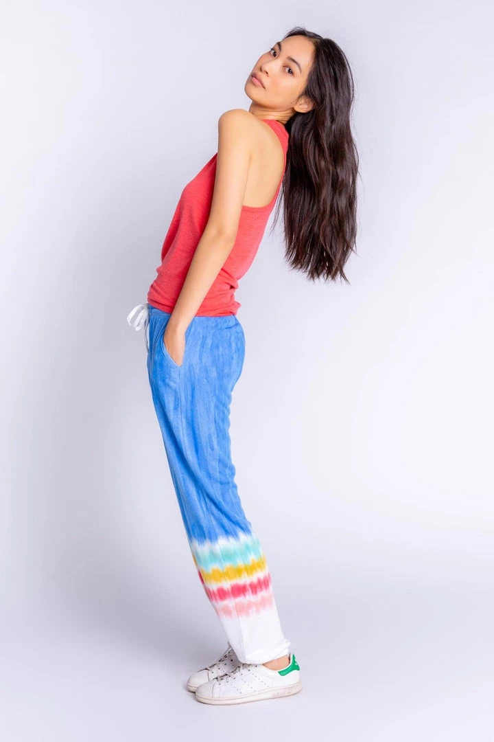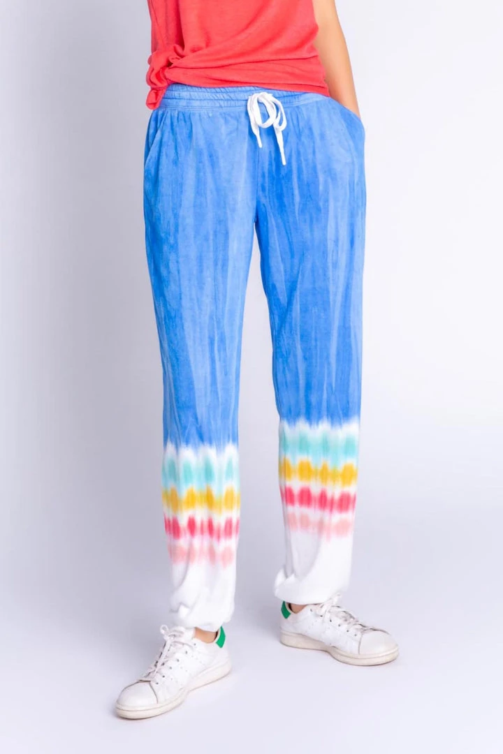 DESCRIPTION:Â Jump in the light – a rainbow light – in the prettiest sky blue and multi-tie dye jogger pant. One of our most popular styles, with comfy pockets & tie waist.