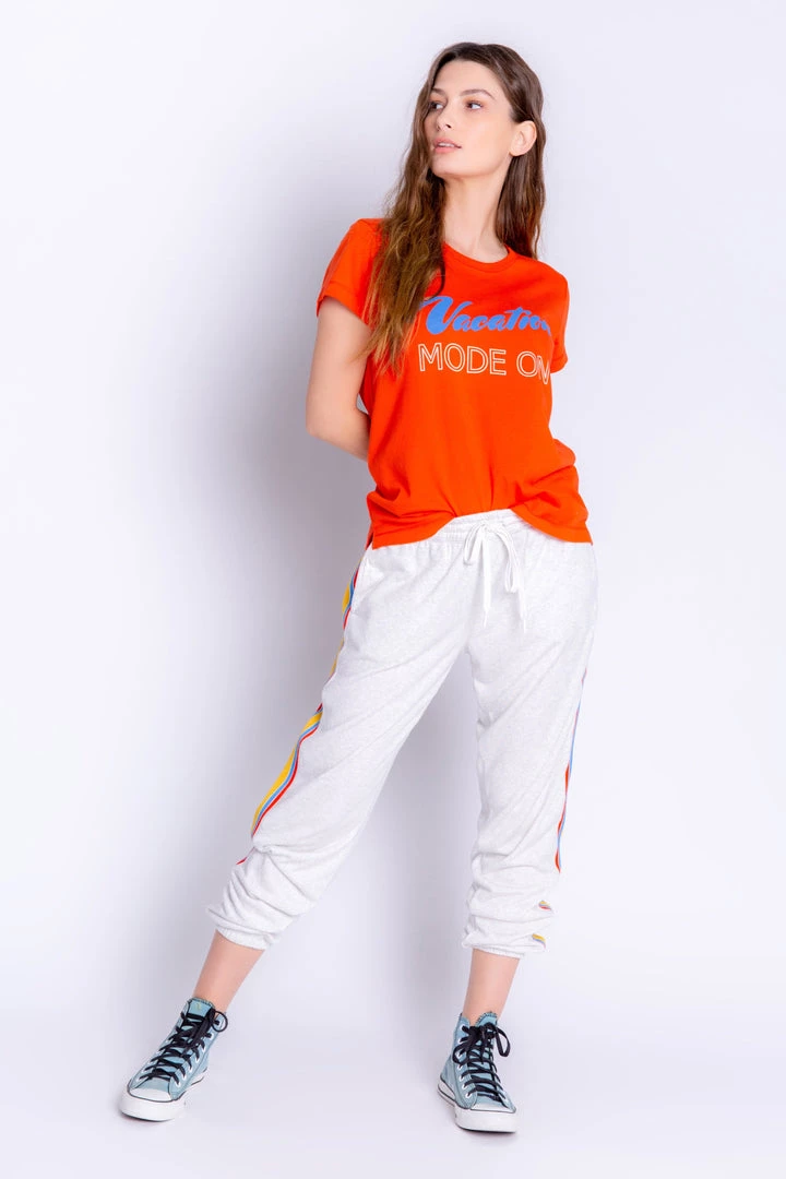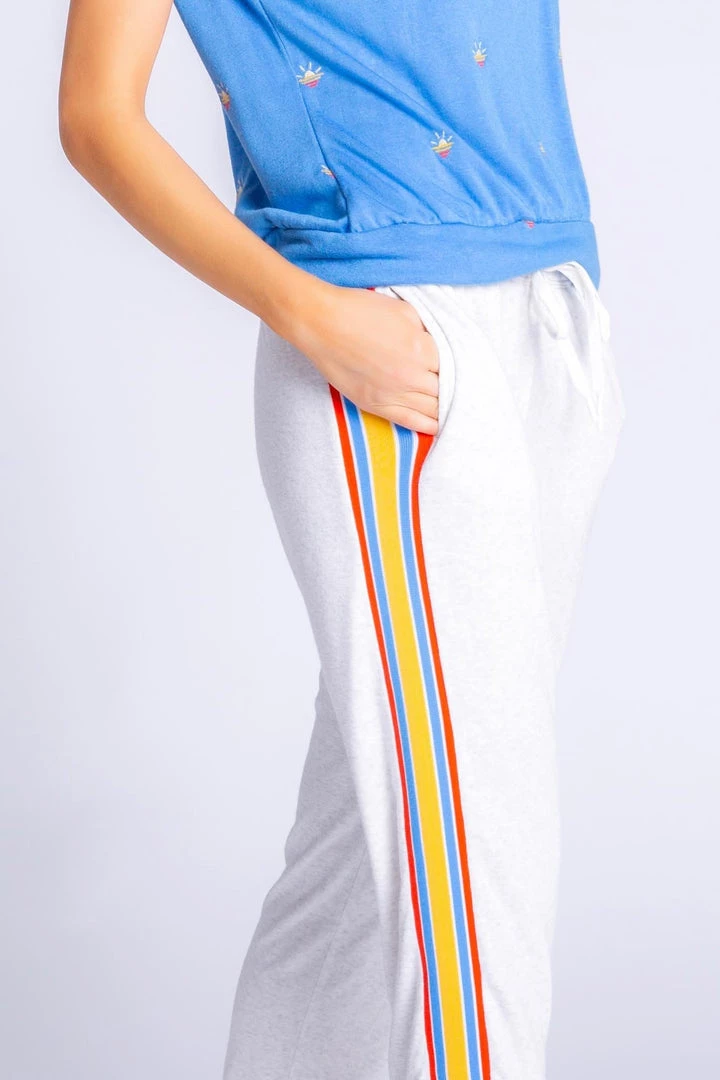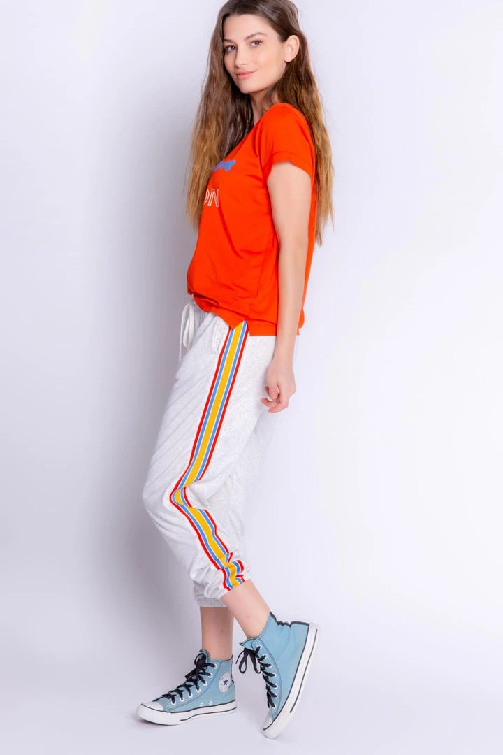 You’ve got all the right stripes. A jogger just begging for an excuse to step out with a colored tee or tank and your favourite kicks. Super soft textured terry knit, with multi-color striped taping on sides.