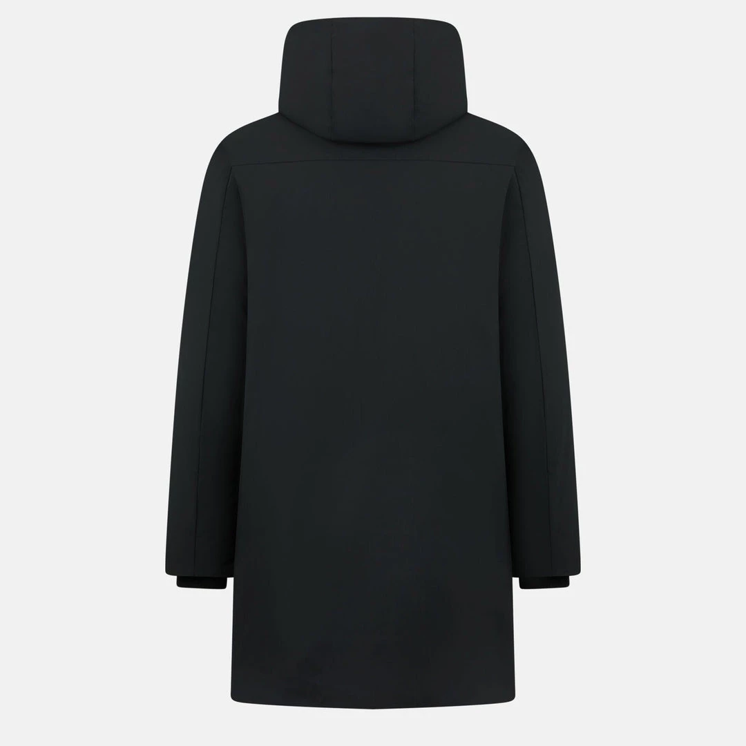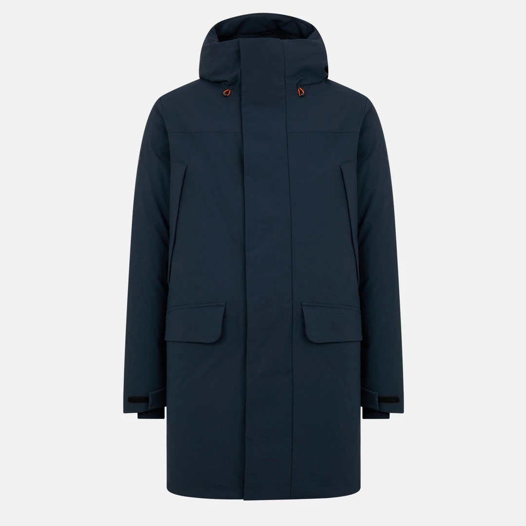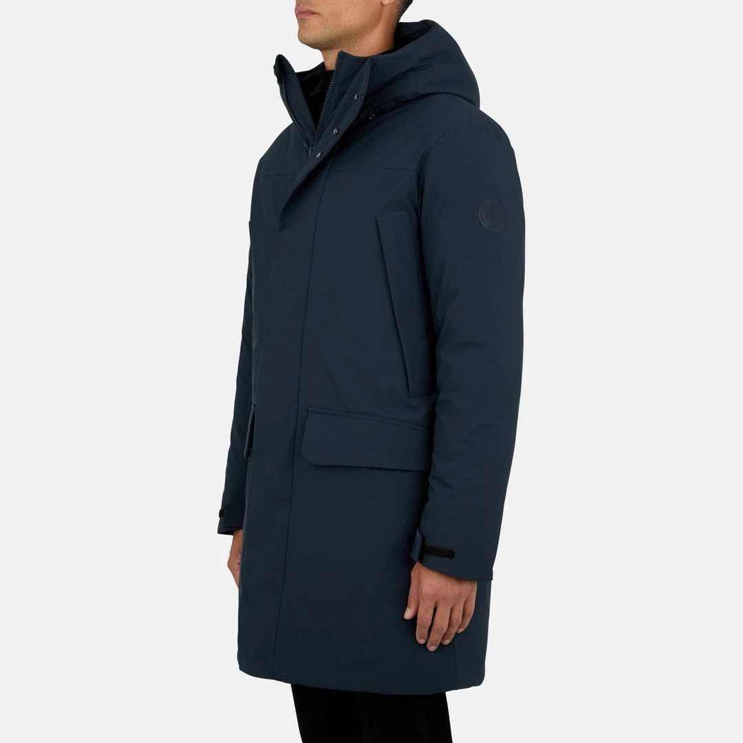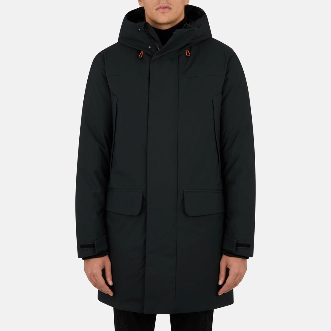 Parka with adjustable hood with drawstring in 100% 3-layer recycled polyester, with high performance in terms of water resistance and breathability. It offers full coverage from cold, wind and humidity. The hood is convertible into the neck by zip, the waist is adjustable with a drawstring and internal knit cuffs. The central zip is double slider covered by flap closed by hidden snap buttons, while the chest pockets are hidden by threads. The low flap pockets are closed by invisible snap buttons, the four inner pockets, one of which on the chest, are closed by zip. Left sleeve finished with arctic logo.