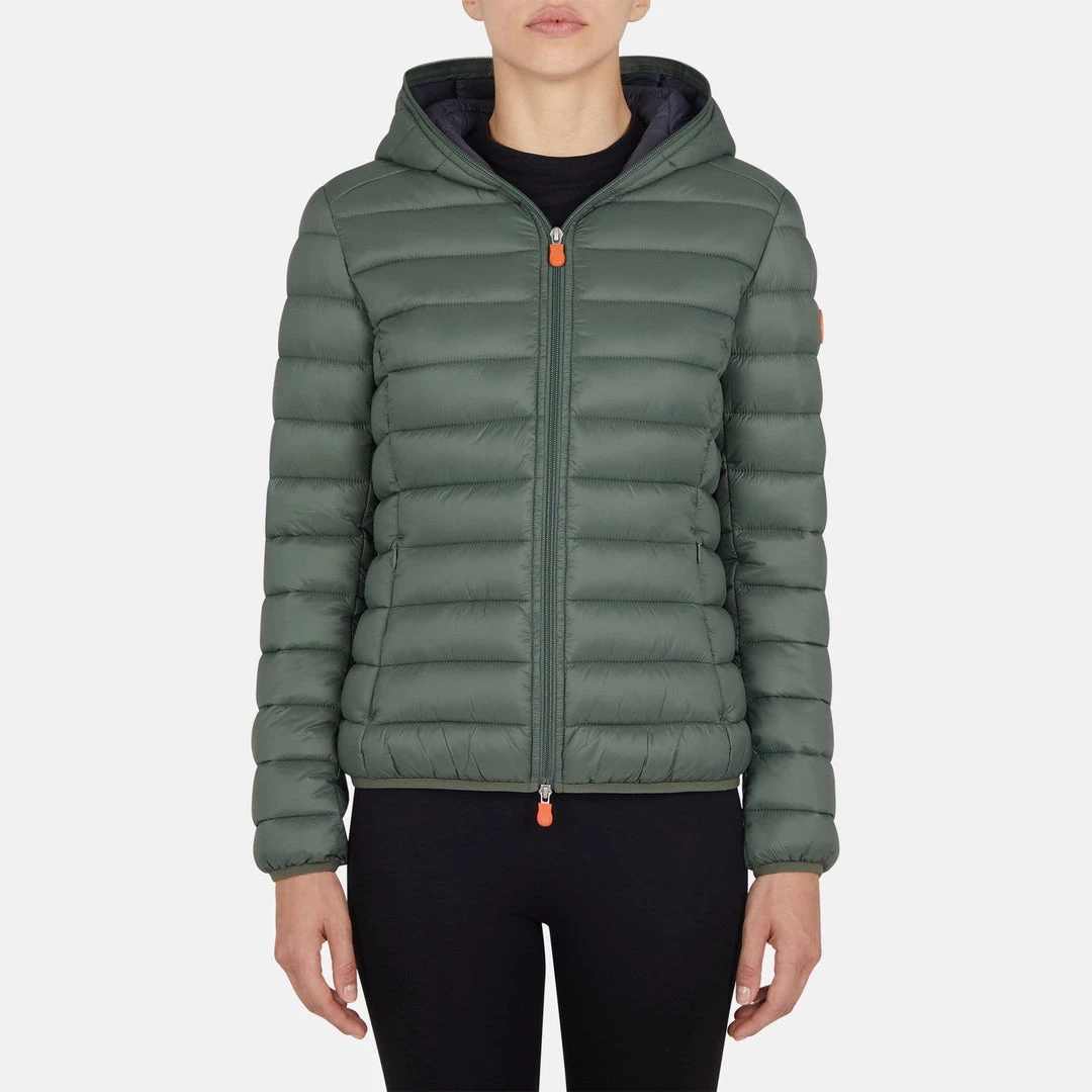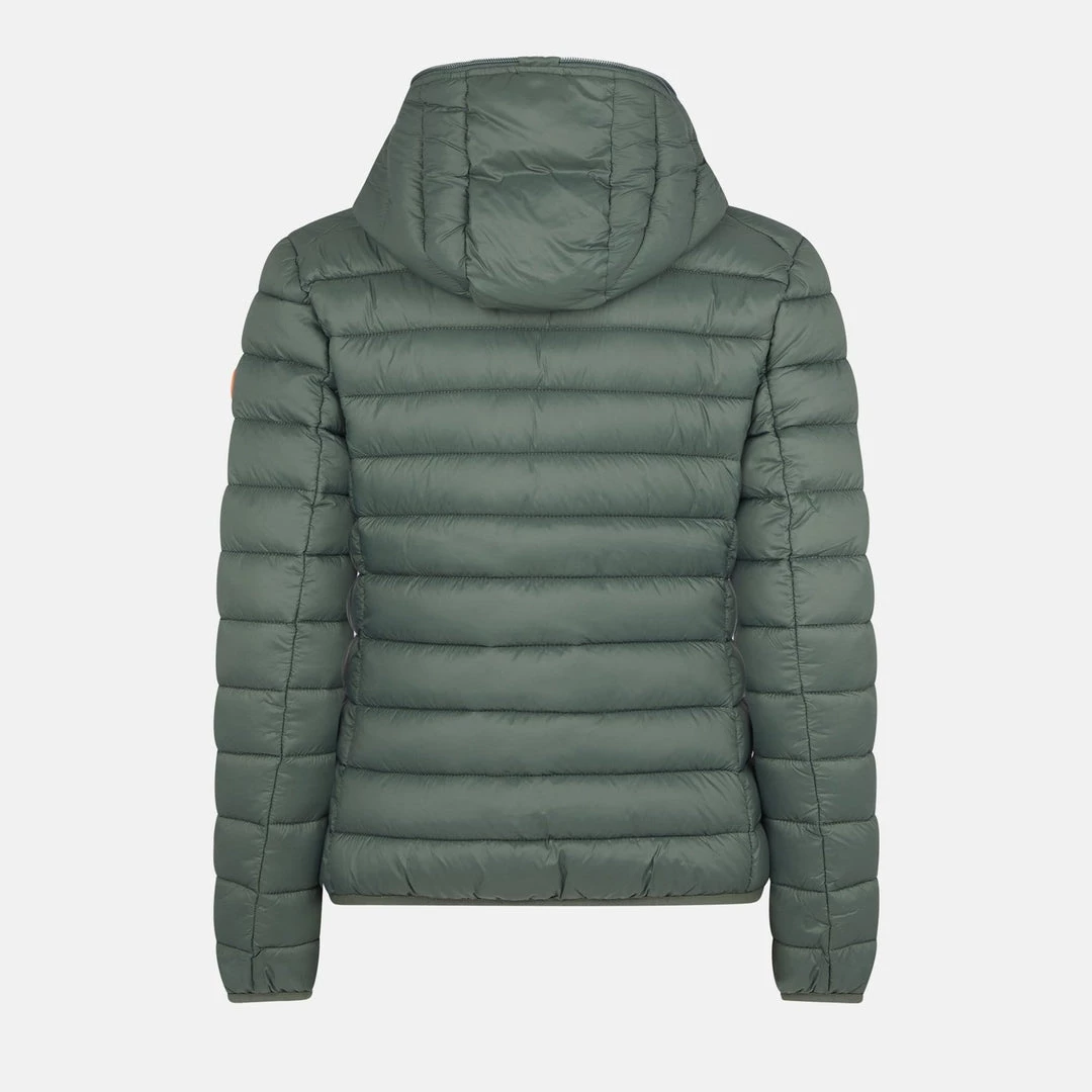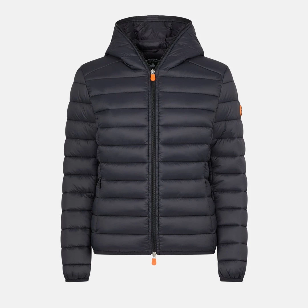 A hooded, quilted jacket made from soft high density 100% nylon. The jacket is lightweight yet resistant, providing protection from water and air, absorbing moisture and drying quickly. Equipped with a central double slider zip, two side pockets with zips and an orange logo on the left sleeve.