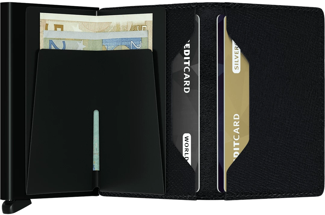 Embossed with a fine Saffiano print, Slimwallet Crisple Black ensures a long-lasting feeling of luxury. This leather is resistant to staining and scratching.