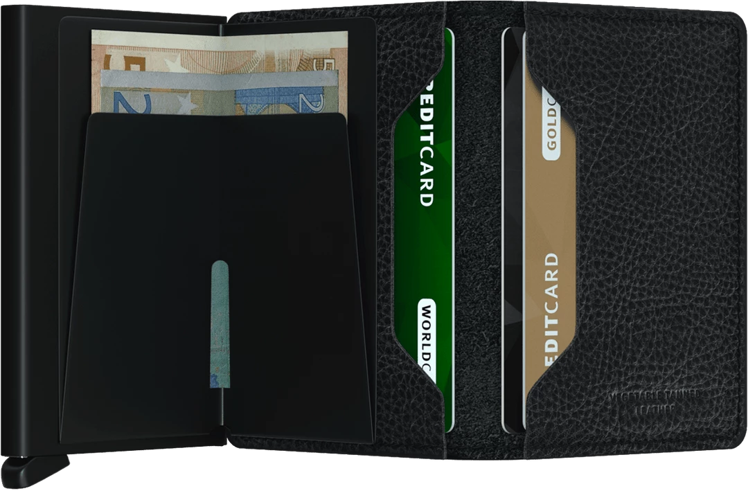 The Slimwallet Veg Black-Black is vegetable-tanned full-grain leather, made in Italy from European cowhide. For more information on leather characteristics, our production process or care instructions, visit our leather page.
