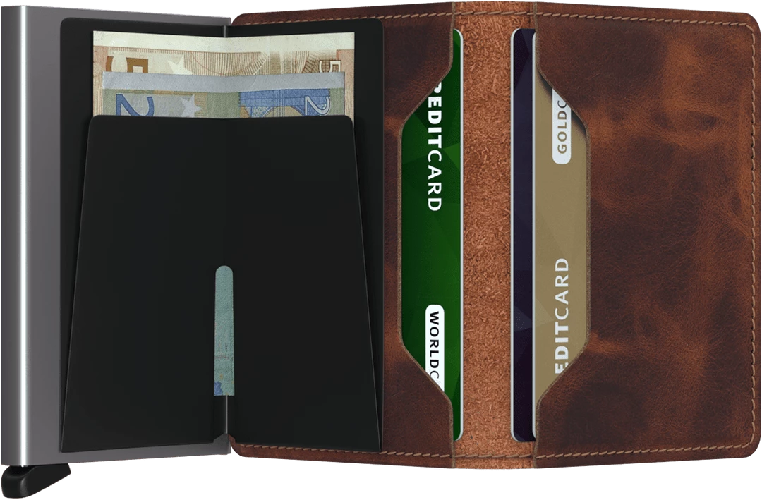 Slimwallet Vintage Brown is corrected-grain leather, made in Holland from European cowhide. For more information on leather characteristics, our production process or care instructions, visit our leather page.