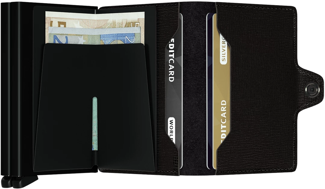 With two Cardprotectors to hold double the content, the Twinwallet carries up to 16 cards, banknotes and receipts, but remains compact in size.