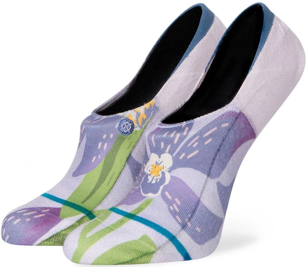 Uncommonly unique are the floral patterns of the Stance Socks Women In Bloom. With a neutral lavender purple hue and darker purple floral, green vines wrap around the sock as well. the no show from Stance offers no slip silicone grip on the heel and an appearance without the showing above the collar of your shoe