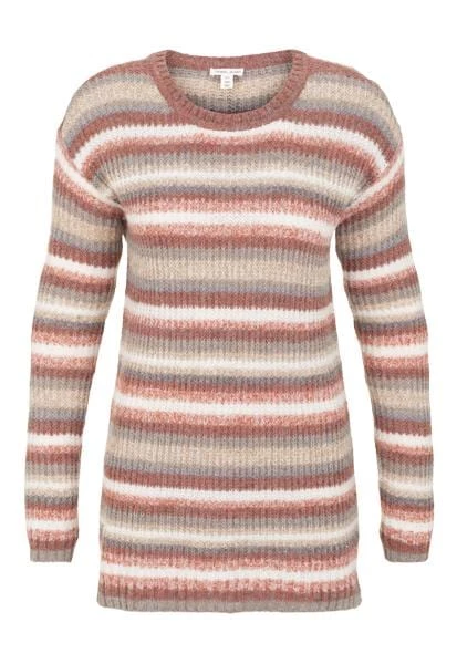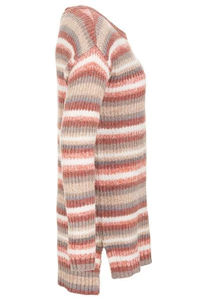 This classic long-sleeved crew sweater has stripes galore! Featuring a wool-alpaca blend knit of fall colors with dropped shoulders, high/low hem, and fashionable side slits, this versatile sweater has all the right cozy features.