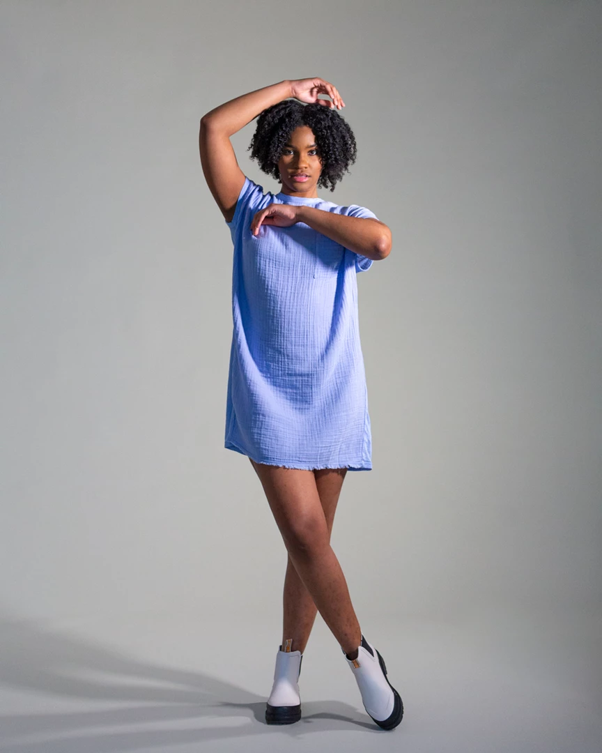 The timeless allure of a cocoon silhouette with its subtle tapering towards the hemline is undeniable. This dress is also a study in subtle contrasts—cotton gauze front with a cotton slub back.