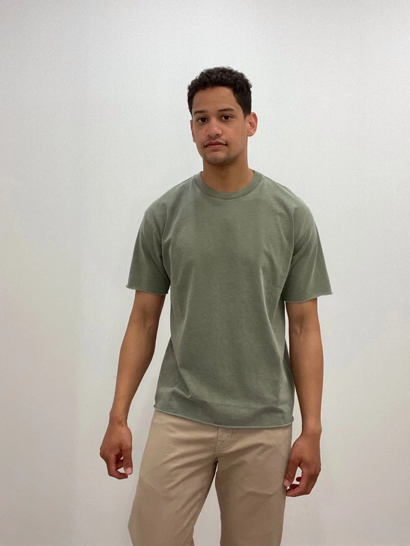 A medium-weight cotton knit gives the vibe of a vintage gym tee. The garment dye lends a soft hand while the raw-edge details on the sleeves keep this guy firmly in weekend mode.