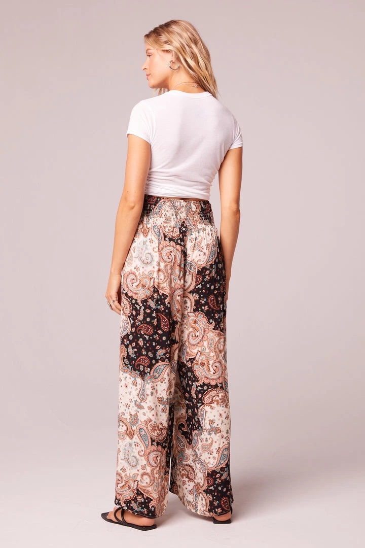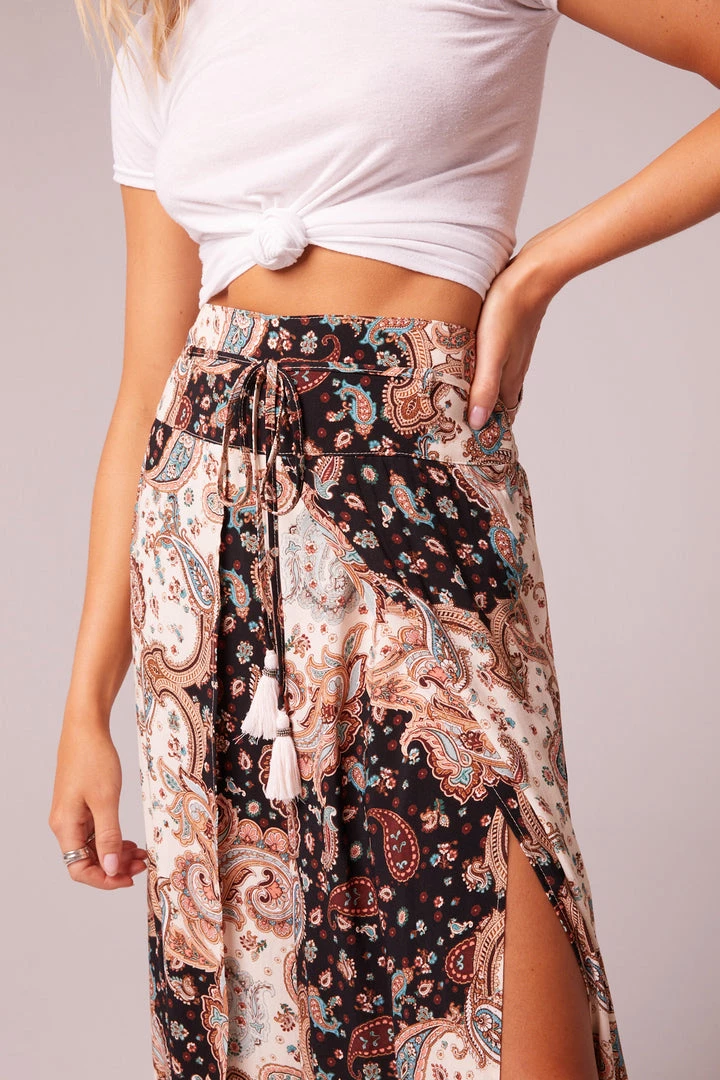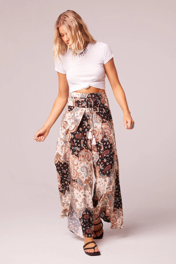These eye-catching pants are sure to turn heads. They are wide-legged and feature a tasseled draw string and slits in both legs.Â
