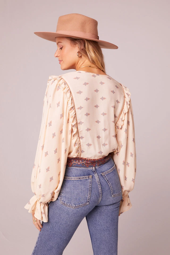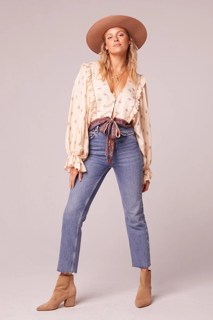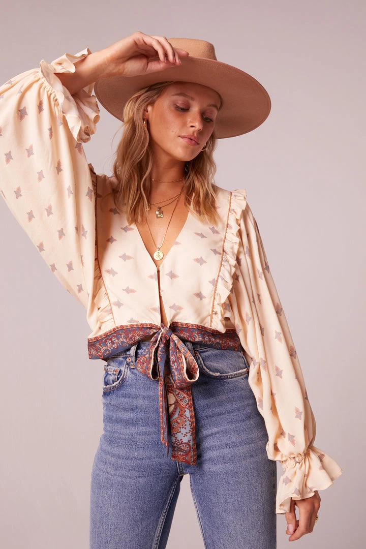 The Sparrow blouse features a beautiful boho paisley pattern with long balloon sleeves. Pair this with a lack of color hat and denim for a casual spring look.