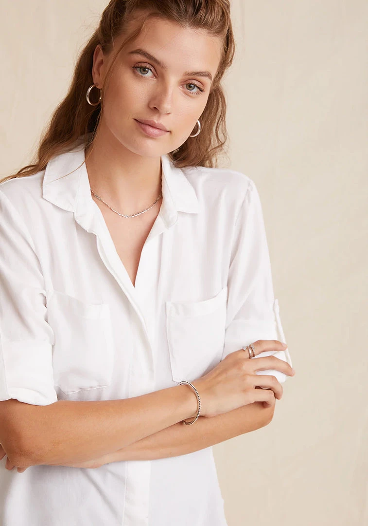 The Split Back Button Down is a signature button-down designed with two chest pockets, a split back detail and roll-tab sleeves. 100% TENCELâ„¢ Lyocell.