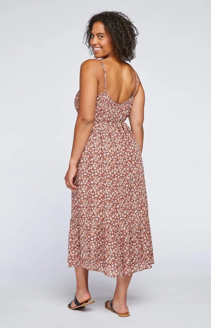 The Florence dress is made of a lightly crinkled crepe with a floral print designed in house. The dress features adjustable straps and a tiered hem. It’s fully lined and has a removable belt for styling versatility.
