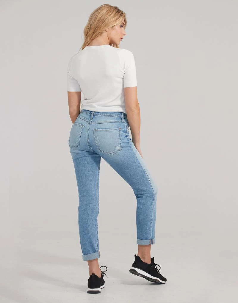 Malia, is our girlfriend jean is a relaxed fit with a tapered leg. Made from our vintage fabric, this open-ended denim provides an extra smooth touch, 4-way stretch and all day support without needing to break them in. The looser silhouette and rolled cuff makes this a great jean for everyday. The 28″ inseam is a classic-rise.