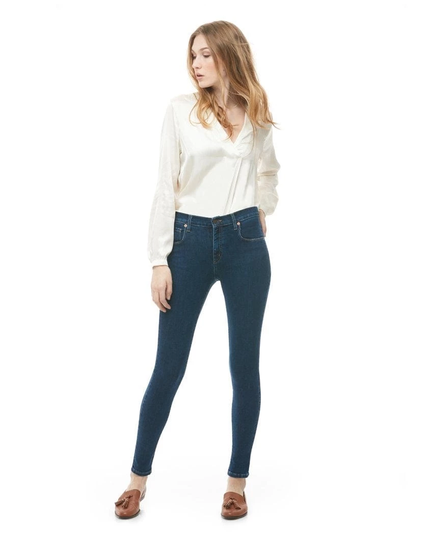 Rachel, is our skinny jeans silhouette, fitted at the hip and ankle and is worn very close to the body creating a figure flattering fit for all body types. Made of a stretch denim fabric, this jean is designed to move with you like a second skin. This deep indigo jean elongates your leg for a lean look.